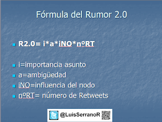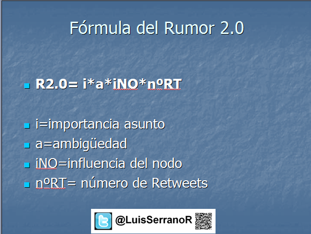 De esta forma y siguiendo este estudio, 1 de cada 5 personas que estén inmersas en una emergencia van a escribir sobre ella e incluso 1 de cada 5 intentará buscar ayuda de los servicios de emergencia a través de sus canales de Social Media. Es evidente, por tanto, que tenemos un problema al que hay que hacer frente y que se hace más grave, si cabe, por efecto de la alta viralidad de los rumores en las redes sociales. Para definir este tipo de rumor propongo la siguiente fórmula.