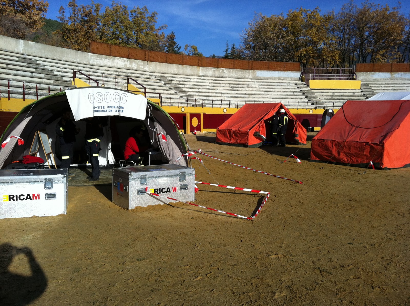 | El OSOCC instalado junto al campamento base en la plaza de toros de Navacerrada |