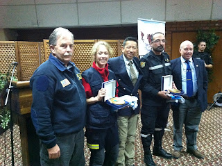 A las 13 horas estábamos ya duchados en la base aérea de Torrejón donde las autoridades de Naciones Unidas hacían entrega a Annika Coll de una metopa y de la bandera oficial del OSOCC para que, si un día llegamos los primeros a una catástrofe, podamos coordinar a todos los equipos de rescate de Naciones Unidas.