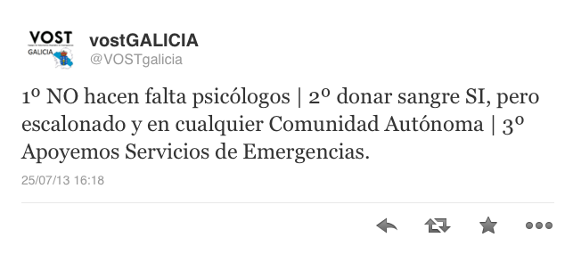 En este caso la Xunta de Galicia tuvo que improvisar el uso de una cuenta en Twitter que no parece estar concebida para gestionar información de catástrofes @Xunta. Y pese a la voluntad de ofrecer información de servicio público, cosa que indudablemente hicieron, se pudo percibir con claridad que detrás faltaban profesionales de la comunicación con experiencia en la gestión de la información de emergencias. Una pena porque, me consta, que en el 112 de Galicia hay unas magnificas profesionales que, de haber tenido una cuenta operativa, lo hubieran hecho muy bien. Fue un error no proponer un hashtag rápido desde la Xunta pero es que cuando se pusieron a tuitear había pasado mucho tiempo. Casi 50 minutos se tardó en poner el primer tweet desde que se produjo el descarrilamiento.