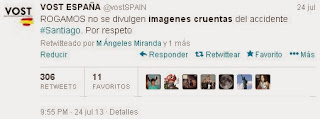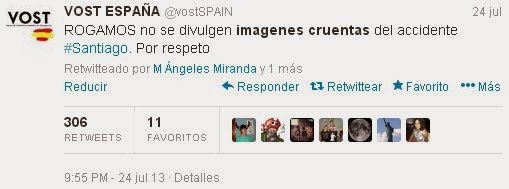 Quiero destacar aquí la labor de los Team VOST (Equipos de voluntarios digitales en emergencias), especialmente de @VOSTGalicia y @vostSPAIN, no sólo en la lucha contra los bulos esa noche y en la labor de facilitar información y recomendaciones útiles a los familiares de la víctimas. Es muy reseñable su esfuerzo recomendando no tuitear imágenes escabrosas. Más de 2.500 retuits tuvo ese tweet y más de 160 favoritos. Lo que da idea del apoyo entre los tuiteros a la iniciativa.